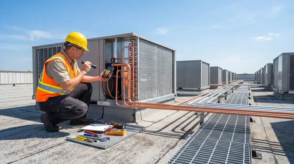 Technician inspecting HVAC unit on commercial rooftop with tools and clipboard in sunlight