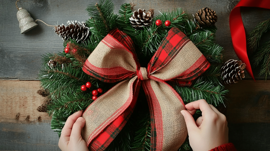 - Take a final look—adjust any uneven areas, fluff the bow, and make sure everything looks festive and well-balanced.
