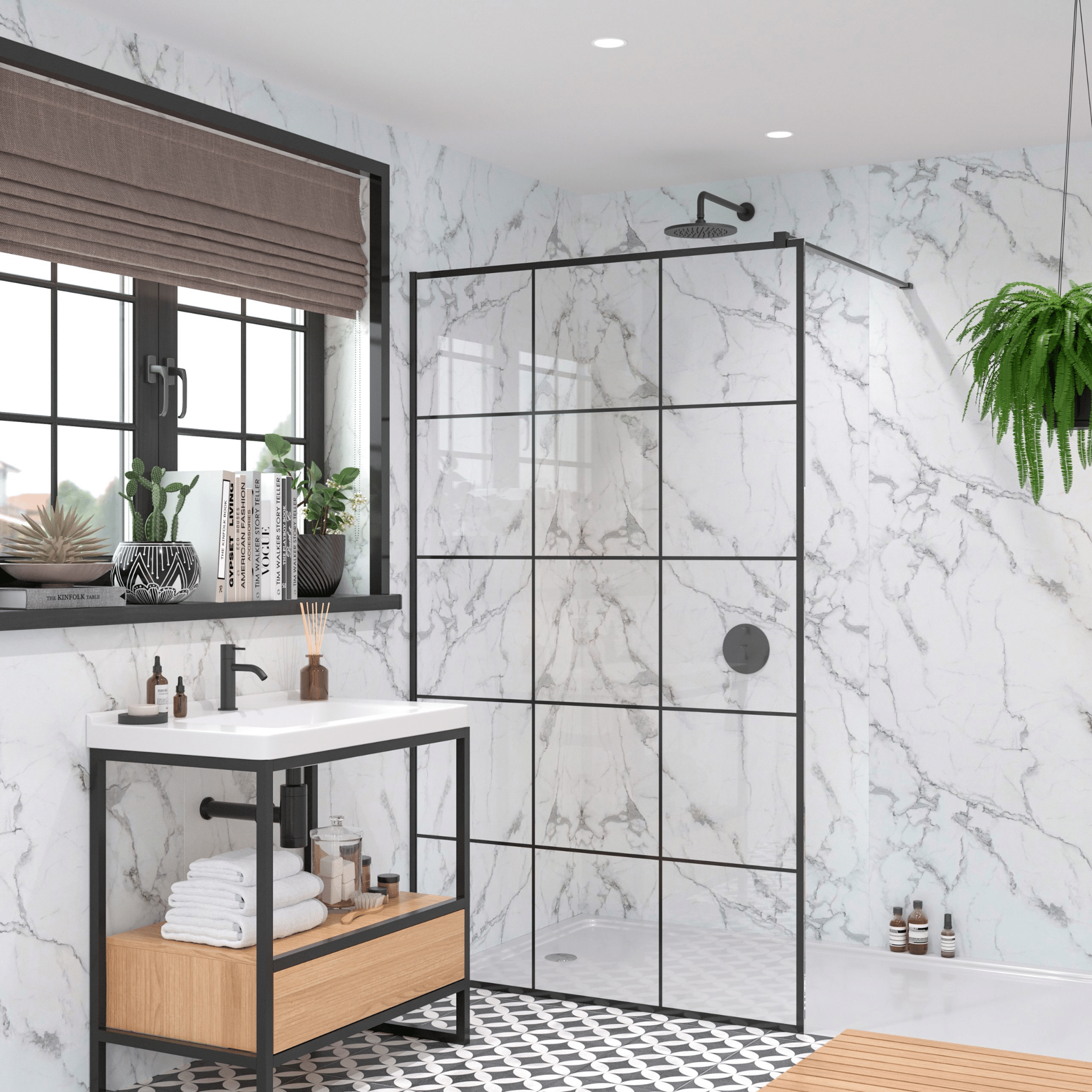 Marble shower panels aren’t just about looks; they’re practical, too. Fewer grout lines mean easier cleaning and a seamless finish. They’re versatile, with finishes ranging from matt to gloss, and tones from light neutrals to dark statement shades.