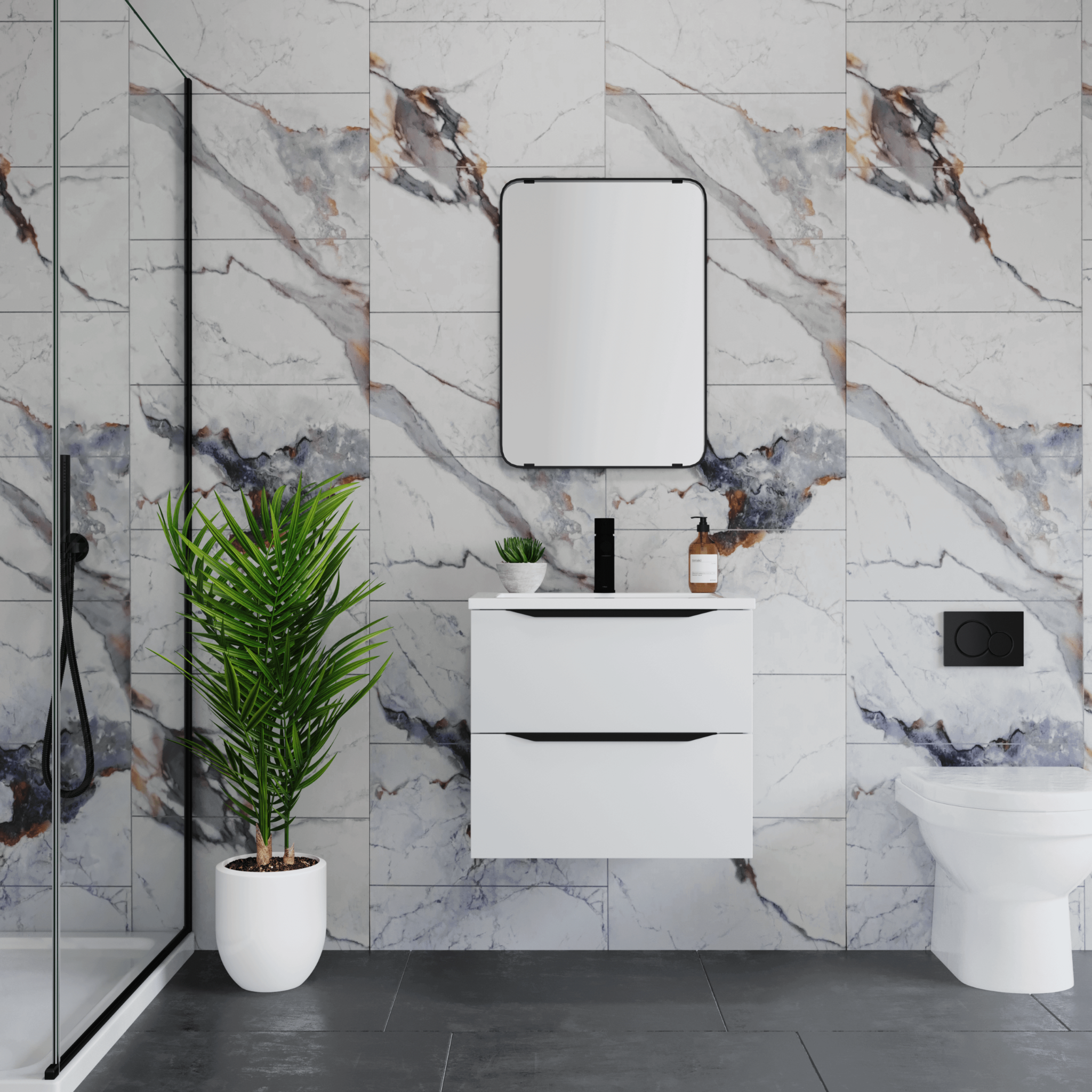 Glamour in a panel, the Marbella Gloss brings the drama without the need for any extra decoration. Its reflective surface and intricate veining catch the eye, making it ideal for smaller bathrooms that need a touch of light and luxury.