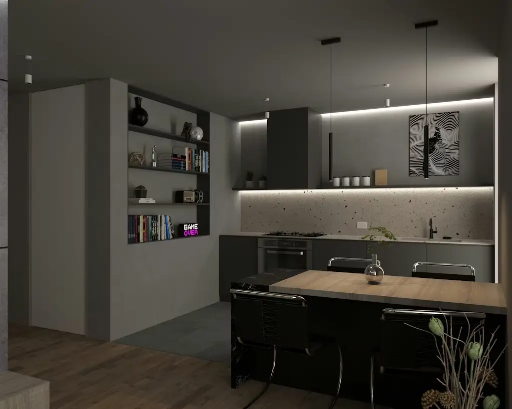 Modern kitchen with dark cabinets, wooden table, and built-in bookshelves under dim lighting